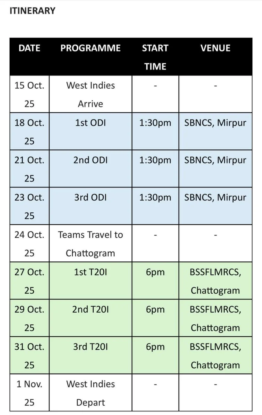 পুরো সিরিজ শেষে ১ নভেম্বর ২০২৫ তারিখে বাংলাদেশ ছাড়বে ওয়েস্ট ইন্ডিজ দল।